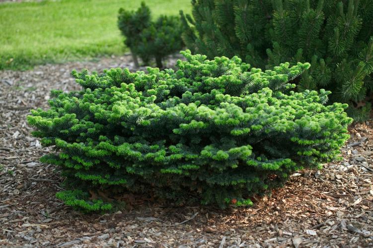 "Нана", Низкая("Nana") - Карликовая форма до 50 см высотой. Крона закругленная, диаметр ее 2 - 2,5 м. Ветви раскидистые, плотные, горизонтально растущие. Хвоя короткая, густая, темно-зеленая, внизу с двумя бело-голубыми полосками, середина и край ее светлее, желто-зеленые. Растет медленно. Теневынослива. Морозостойка. В культуру введена в 1850 году. Пригодна для каменистых садов, а также для выращивания в контейнерах, для озеленения террас и крыш. Рекомендуется сажать группами на газоне или солитерно, в альпинариях.