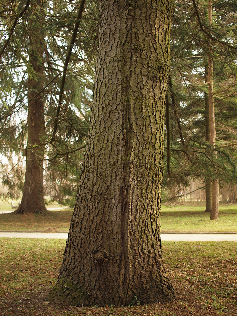 Представляет собой высокое дерево, до 25 м в высоту, ствол до 1 м в диаметре. Кора на молодых деревьях серая и гладкая, позже становится шелушащейся, трещиноватой с возрастом и коричнево-серой. Крона конической формы, плотной, разветвленной. Ветви направлены горизонтально. Побеги от желто-зеленого до коричневого цвета, голые, блестящие. Почки яйцевидные, крупные, темно-коричневого цвета, не смолистые или практически не смолистые.