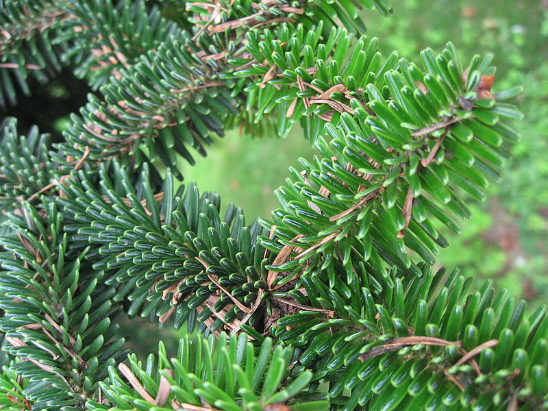 Хвоя расположена плотно, 15-20 мм в длину 2-3 мм в ширину, толстая, жесткая, темно-зеленого цвета, снизу с 2 зеленовато-белыми линиями, кончики обычно заостренные, реже слегка выемчатые.