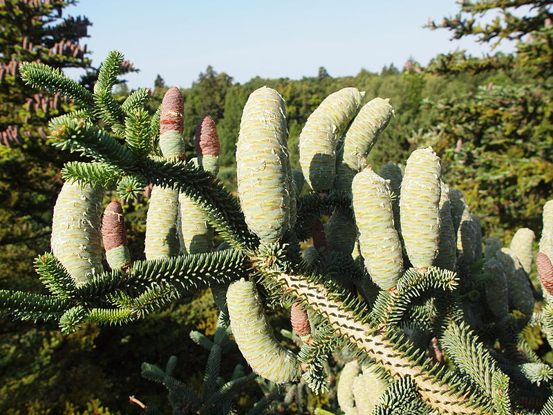 Шишки сизо-зеленого цвета с розовым или фиолетовым оттенком, после созревания становятся коричневыми, цилиндрической формы, 15-20 см в длину, 3,5-5,5 см в ширину. Семена 12-14 мм в длину, крылья длиннее семени. Вес 1000 семян = 70 г.