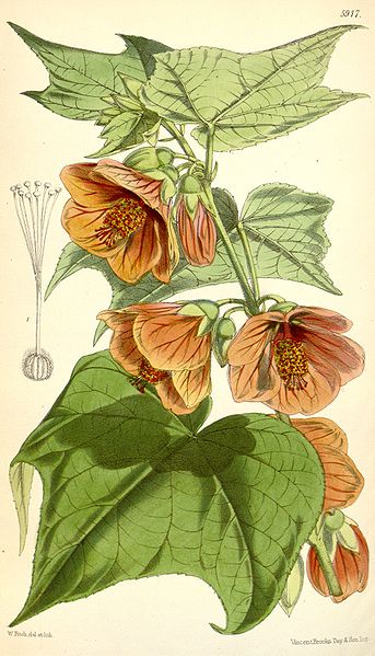 - Abutilon striatum — Абутилон полосатый, пёстрые тёмно-зелёные листья и цветки с оранжевой или красной окраской.