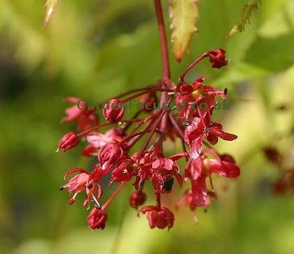 Цветки мелкие, собраны в прямостоячие, малоцветковые щитки по 10-20 цветков, каждый цветок имеет пять красных или пурпурных чашелистиков и пять беловатых лепестков. Тычинок 8. Завязь голая. Цветет в мае.