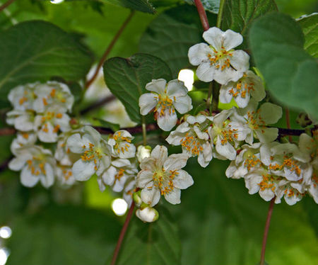 Цветки правильные (актиноморфные), белого цвета или розоватые снаружи, с приятным тонким ароматом, двудомные, реже однодомные, однополые, с двойным околоцветником. Цветоножки тонкие, поникающие. Лепестков и чашелистиков 5. Чашечка засыхающая, остается при плодах. Тычиночные цветки достигают 10 мм в диаметре, растут в трехцветковых щитках. Обоеполые и пестичные цветки мелкие, до 15 мм в диаметре, растут по одному в пазухах листьев. Столбики в числе 8-12 (16), сросшиеся при основании и дуговидно отогнутые на вершинке, оканчиваются головчатыми рыльцами. Пестик с многогнездой завязью. Тычинки многочисленные, свободные. Завязь верхняя, голая.