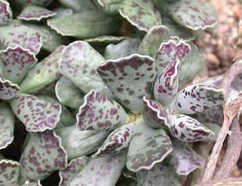 Слабоветвящийся суккулентный кустарничек до 10 см высоты. Листья округлые или немного удлиненные, 4- 5 см длины и 3-4 см ширины, темно- зеленые с красно- коричневыми пятнами на обеих сторонах. Цветки красно- коричневые. Родина - Южная и Юго-Западная Африка.