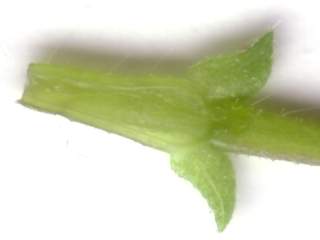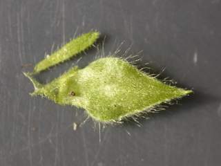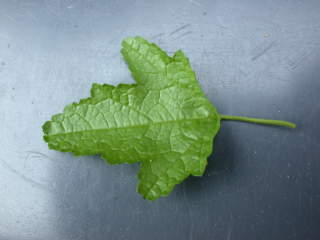 Листья очередные, простые, яйцевидно-ланцетной формы, 3-лопастные, клейкие. Лопасти треугольные, неравномерно-зубчатые, покрыты щетинками на жилках с верхней и нижней стороны, реснитчатые у основания, до 6,5 см в длину и ширину. Черешки до 2,5 см в длину, зеленые, волосистые. Прилистники 1-2 мм в длину, голые, треугольно-яйцевидные.