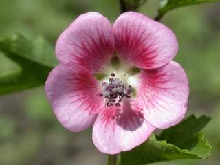 Цветки похожи на цветы мальвы, расположены в пазухах верхних листьев и боковых побегов, Цветет с апреля и до осени. Цветоножки до 4 см в длину, покрыты волосками. Прицветников 3, они ассиметрично расположены, ланцетовидные, опушенные, до 6 мм в длину, реснитчатые, расположены на 1 мм ниже чашечки. Чашелистиков 5, сросшиеся на треть длины, треугольно-яйцевидные, заостренные на концах. Венчик бледно-розовый с более темными прожилками, лепестков 5, они расположены спирально, не перекрывают друг друга, до 15 мм в длину, вершинки округлые, основание когтевидное. Тычинки до 10 мм в длину, нити розовые, пыльники черные, почковидные, одногнездые. Интенсивность окраса прожилок изменяется сезонно, наиболее интенсивные весной.