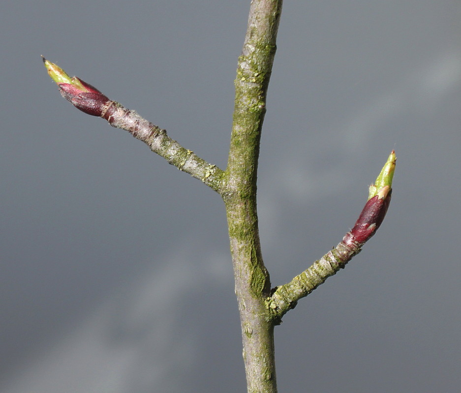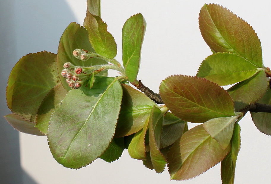 Leaves 3-6 cm long, from elliptical to oblong-lanceolate, acute or shortly acuminate, apex drawn into a short point, with a rounded or cuneate base, margin finely crenate-serrate, coriaceous, when unfolding reddish-brown, above dark green, glossy, glabrous, below slightly pubescent, lighter, in autumn turning brownish-red.