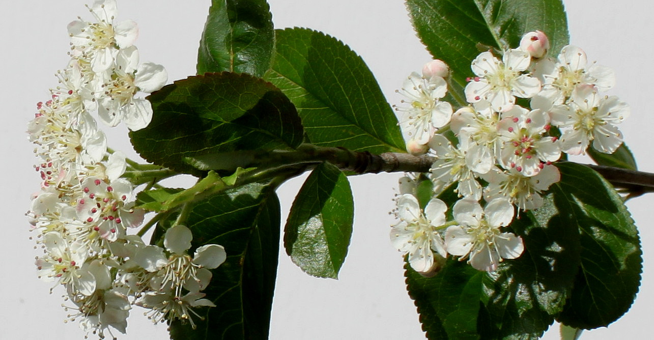 Flowers white or slightly pinkish, bisexual, up to 1.2 cm in diameter, grouped 12-20 per corymbiform glabrous inflorescences up to 5 cm in diameter. Perianth double; petals free, 5 in number; stamens 18-20; anthers purple, rising above the stigmas. Pollen light yellow. Blooms in the second half of May until early June, flowering lasts depending on the weather 12-16 days.
