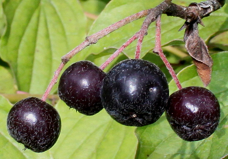 Fruits spherical, less often depressed-globose, glossy, black or black-purple in color, with a glaucous bloom, reaching 6-8 cm in diameter, edible, tart-sweet with an astringent tang. Weight of one fruit 0.6—1.5 grams. Fruits ripen in August – September. Begins bearing fruit in the 3rd-4th year after planting.
