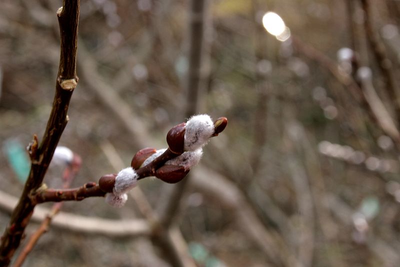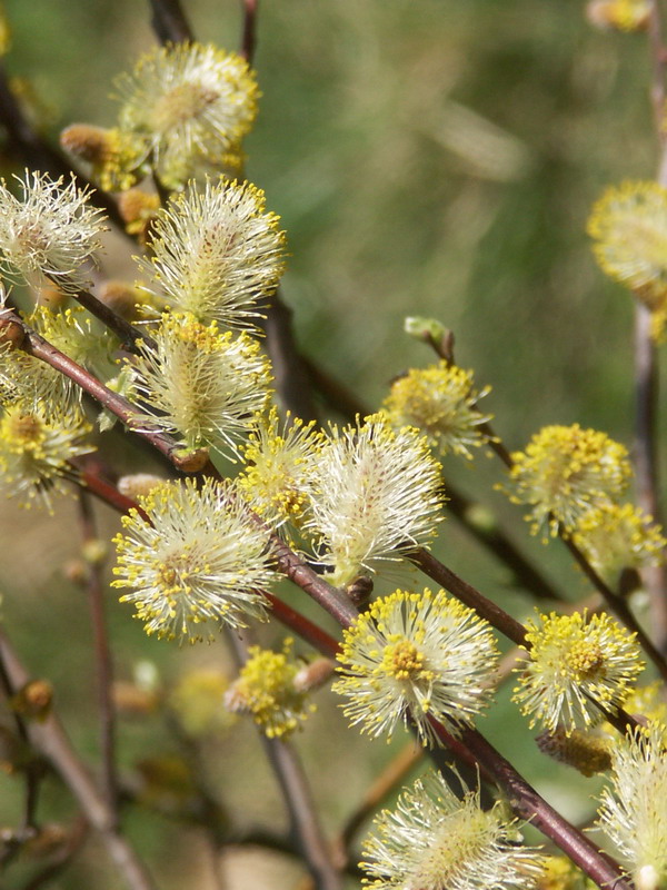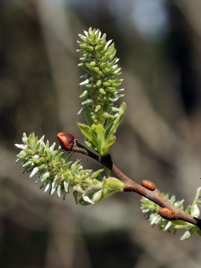 Catkins open before the leaves or simultaneously with them, in late April-May. Male catkins are shortly ovoid, sessile, 1-2 cm long. Female catkins reach 2.5-3 cm in length, borne on a short stalk with small leaves. Calyces hairy, ligulate, unicolorous, light-brown, with a darker apex. Stamens 2, pubescent at the base, free. Nectar gland 1. Anthers yellow. Ovary ovoid-subulate, bluntish, silky-hairy, borne on a long stalk. Bracts brown or with a black tip, shortly hairy.