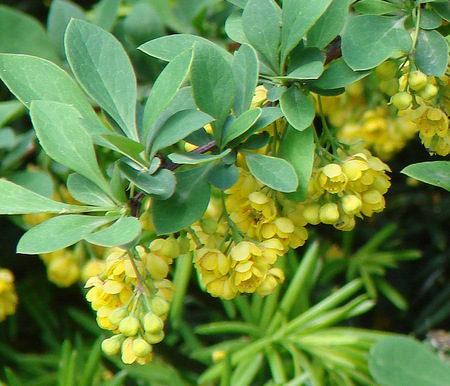 Flowers are arranged in racemes and located on short lateral shoots, less often in small-flowered clusters at the tips of shortened shoots. There are 8-9 sepals, colored and externally similar to petals, the outer ones smaller than the inner. The corolla consists of 6 yellow petals, each with two nectaries at the base. Stamens 6. Pistil 1. Style short with a unilocular ovary and a small number of ovules.