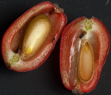 Fruits are elliptical, ovoid or almost spherical berries 0.8–1.2 cm long, black or red in color, with a dried persistent stigma and 1–5 seeds, not falling until winter. Seeds are ribbed, cylindrical, narrowed at the ends, shiny, brown, 4–6 mm long and 1.8–3 mm wide.