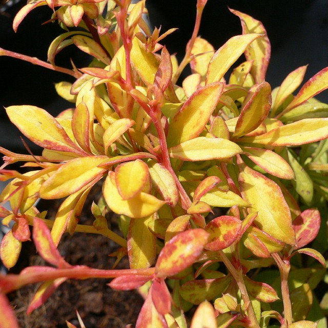 Листья почти сидячие, небольшие, 1,9 см в длину и 0,7 см в ширину, от обратноланцетовидных до обратнояйцевидных, ярко-желтые. В конце лета – начале осени приобретают оранжево-коралловые тона. Корешки короткие, до 1 см в длину и в диаметре .