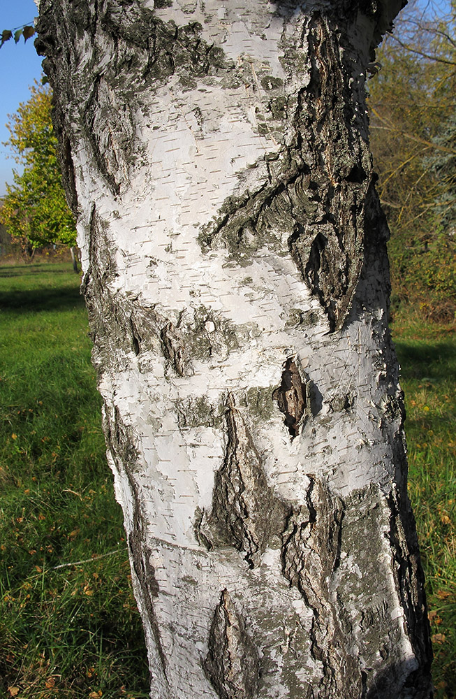 It is a deciduous tree reaching 25–30 m in height, with a trunk diameter up to 80 cm. It lives up to 120 years. The root system is shallow but well developed (trees are susceptible to windthrow). Young trees have brown bark, mature trees have white bark, and old trees have black, cracked bark on the lower trunk. The wood is yellowish-white, dense and heavy. Branches are reddish-brown, glabrous, covered with numerous densely scattered resinous glandular warts (hence the name warty birch). Young shoots are pendulous, the crown is not dense, branched, with sympodial branching. Terminal and lateral buds are formed on the current year shoots in summer and open in spring. Buds are sessile, pointed, sticky, covered with imbricate scales.