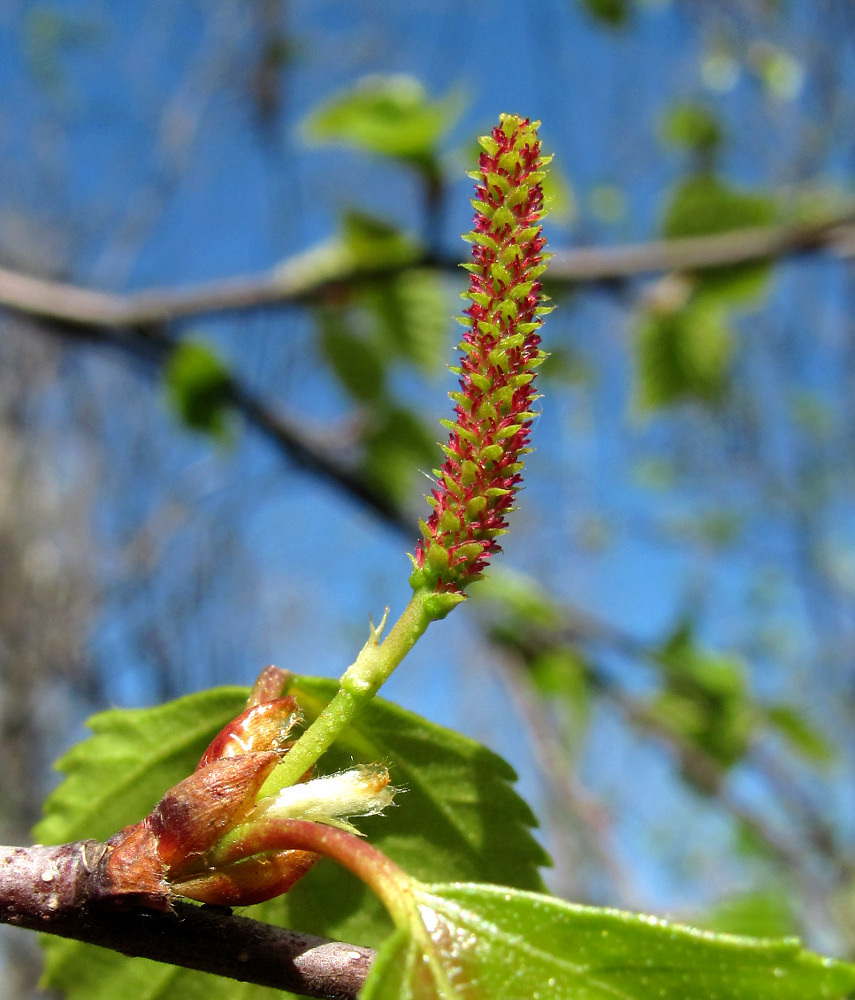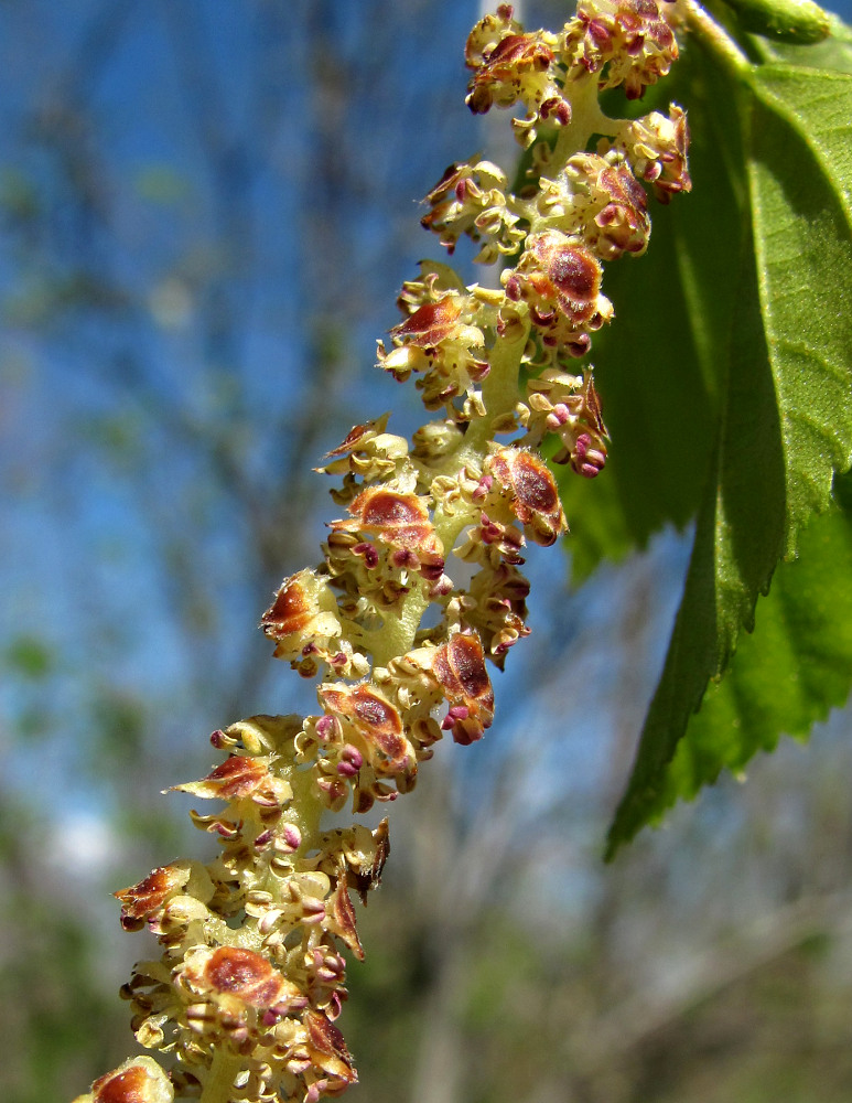 Flowers are small, regular, inconspicuous, unisexual, arranged in sessile, pendulous catkins that grow at the ends of twigs. They flower before leafing (or during leafing). Male flowers on short pedicels are arranged in threes (only one more developed), dichasially in the axils of reddish-brown bracts, forming on the ends of elongate shoots of the previous year 2–4 hanging male catkins up to 5–6 cm long. The perianth is simple, one- or two-leaved. There are 2–4 stamens with bifid anthers positioned opposite the perianth scales. Female flowers lack a perianth, have 2 bracts and a fused three-lobed bract scale. They are gathered in fives in dichasia, grow on shortened lateral shoots and form short, cylindrical green female catkins. When ripe they become rigid and fall off with the fruits. The gynoecium is formed by 2 fused carpels. The ovary is inferior, with one ovule. Styles are filiform, long, exserted, often brightly colored.