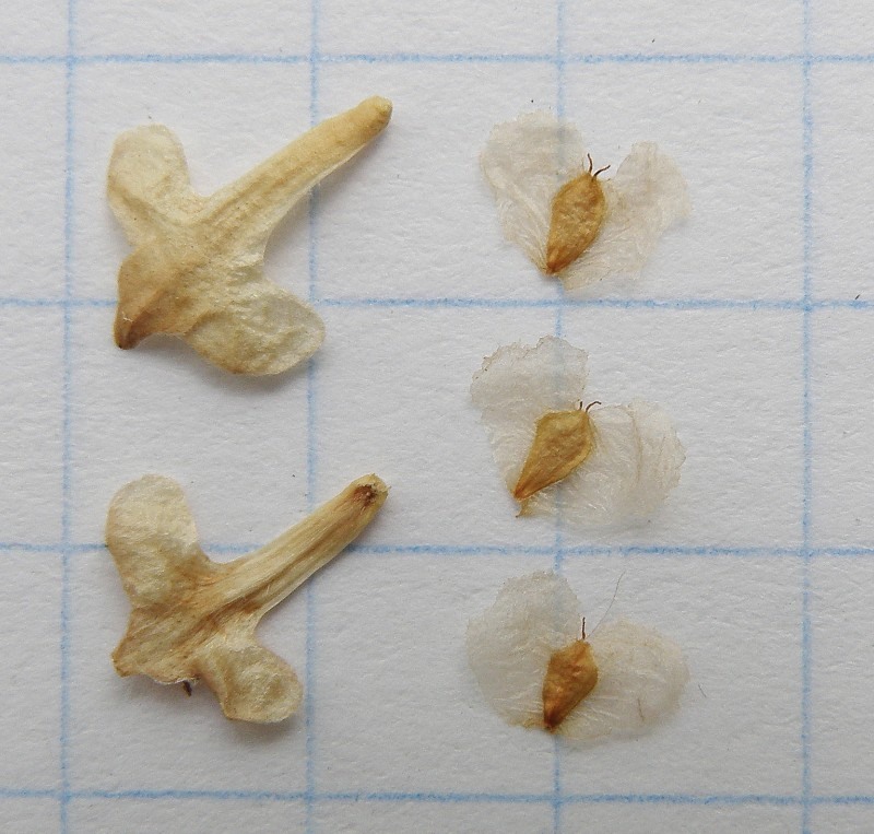 Fruits are small, laterally compressed nutlets with two membranous wings and two dried styles at the top. It fruits annually from age 10, in plantations from 20–25 years. Fruiting occurs from July until late autumn (depending on weather). Seeds are dispersed in autumn and winter. Weight of 1000 seeds - 0.17—0.22 g.