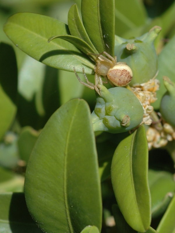 Самшит вечнозеленый (Buxus sempervirens L.). Завязавшийся плод. Алматы, интродукционный питомник. .