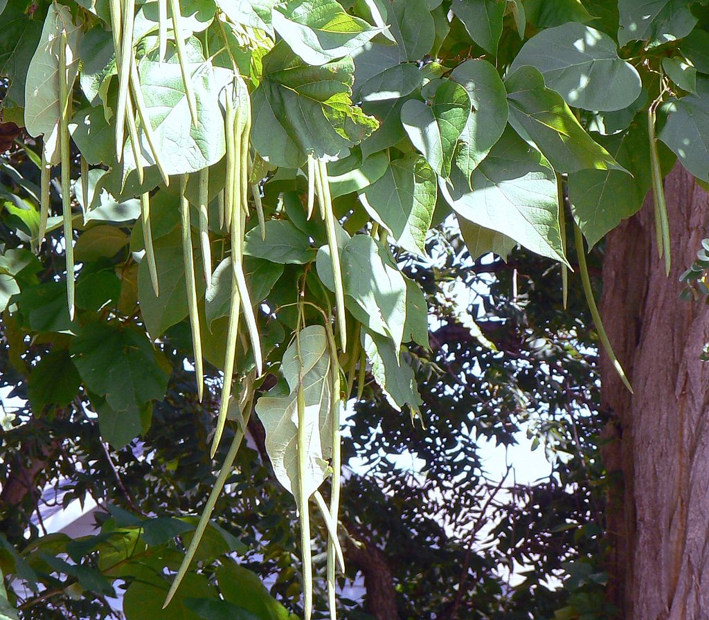 Плоды – длинные, свисающие, тонкие коробочки, внешне похожи на стручки бобовых. Плоды остаются висеть на дереве в течение всей зимы. Семена плоские, тонкие, с острыми крыльями, на концах с бахромой из длинных белых волосков.