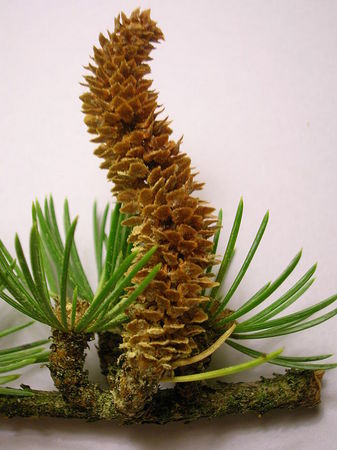 It flowers in autumn. Male catkins are borne singly, at the ends of short shoots, at the base surrounded by tufts of needles, erect. Female catkins reach 5 cm in length, stamens numerous, arranged spirally, almost sessile. Each stamen has two fused anthers that split longitudinally. Pollen has air sacs.