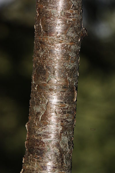 Листья черешковые, широкоэллиптические, заострённые, тёмно-зелёные сверху, снизу светлее, достигают в длину 8 см. Кора коричневая, гладкая, блестящая, декоративная.