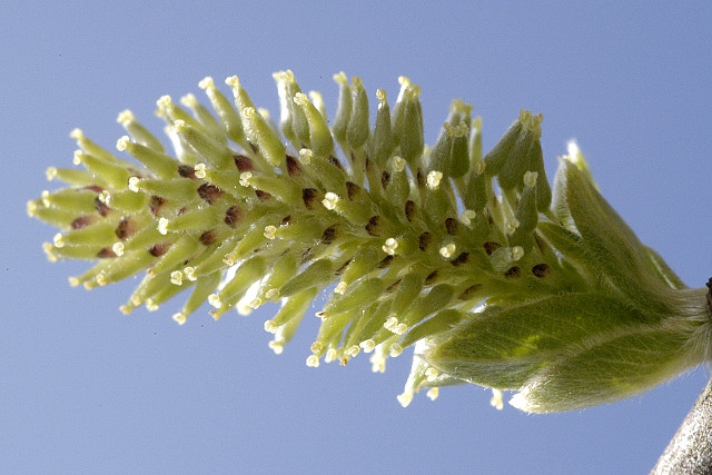 Flowers in April, before leaf unfolding or simultaneously. Male catkins thin, almost sessile, densely flowered, 2 cm long, grey-silky, later yellow, with 3-7 small bracts at the base. Stamens 2, anthers golden-yellow, nectary oblong, solitary, posterior. Female catkins cylindrical, greenish, 3-4 cm long, up to 8 cm when fruiting, ovary grey-woolly, elongated-conical; style short, sometimes divided.