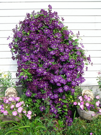Обрезка: клематис Жакмана цветет на побегах текущего года. Первую обрезку необходимо проводить в начале лета, для этого вырезают слабые побеги для усиления цветения на основных побегах. После этого в конце июня 1\3 или 1\4 часть побегов обрезают над 3-4 узлом для продления срока цветения. После такого рода обрезки на верхних почках верхних узлов вырастают побеги второго порядка, из которых через 45-60 дней появляются новые цветы. После первых заморозков все побеги обрезают на высоте 0,2-0,3 м над уровнем земли. Без такой обрезки лианы сильно подвержены болезням и хуже цветут.