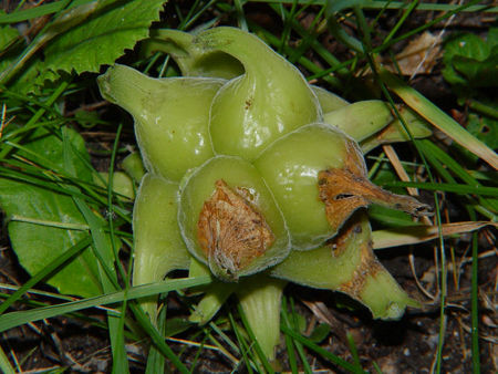 Плоды – небольшие орехи, собранные по 4-6 штук вместе. Обертка сильно бороздчатая, стянутая над верхом и выше рассеченная на вильчато-раздвоенные серповидно изогнутые, острые, зубчатые доли. Орехи яйцевидно-шаровидные, 1-1,5 см в диаметре. Плоды зреют в октябре. В условиях Украины не плодоносит.