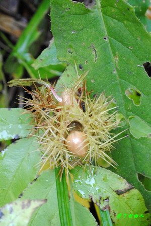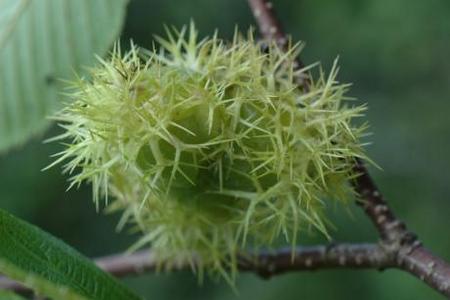 Плоды – съедобные яйцевидно-шаровидные орехи 1-1,5 см в диаметре, с опушенной вершинкой. Обертка колючая, длиннее ореха, глубоко-двураздельная, до середины рассеченная на колючие перисто-ветвистые лопасти, пепельно-бархатистые внутри и снаружи, зеленого цвета. Плоды созревают в сентябре.