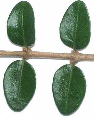Leaves broadly ovate or obovate in shape, slightly undulating, 0.6-1.5 cm long and 0.4-1 cm wide, base broadly cuneate or rounded, shortly acuminate, with a short mucro or small point at the apex, often rounded, dull and densely green above, glabrous, below – light green and slightly pubescent. In autumn they turn scarlet to dark wine-red. Petioles very short.