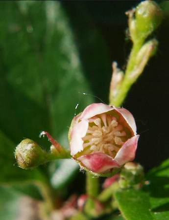 Цветет в мае-июне, в течение месяца. Соцветия – рыхлые щитковидные кисти, состоящие из 5-12 цветков. Чашелистики широко-треугольной формы, в 2,5-3 раза короче лепестков. Тычинки в числе 20, столбиков 3, реже 4. Цветы мелкие, розовые, располагаются по всей длине побега, практически закрывая листья.