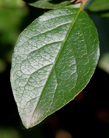 Листья эллиптической и до яйцевидной формы, заостренные, 1,7-5 см в длину и 0,8-3,5 см в ширину, темно-зеленые сверху, блестящие, голые, снизу – сначала опушенные, желтовато-войлочные, позже становятся почти голыми, желтоватыми. Осенью листья приобретают темно-коричневато-красные оттенки.