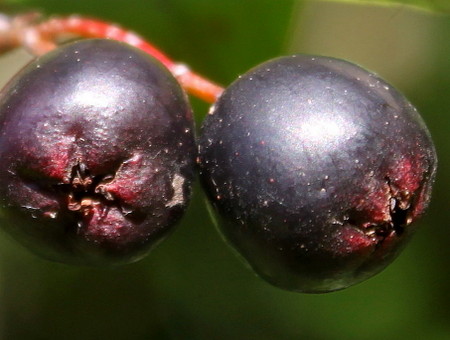 Плоды черные, блестящие, шаровидной, слегка продолговатой формы, 7-9 мм в диаметре, густо волосистые на верхушке. Мякоть коричневато-красная, сочная, блестящая. Косточки в числе 3, реже 2. Плодоносит в конце сентября – начале октября. Плоды сохраняются на кустах до морозов. Плодоносить начинает на 4 год.