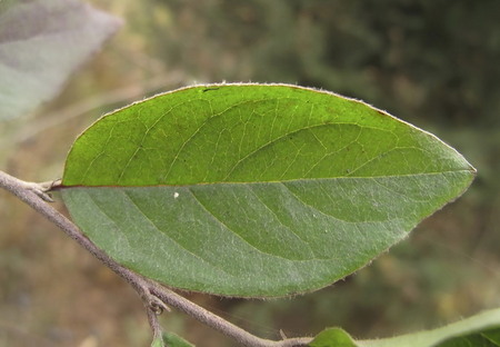 Листья яйцевидной или эллиптической формы, до 2-6 см в длину и 1-3 см в ширину, с тупыми или выемчатыми, реже заостренными вершинками, и округлым основанием. Черешок опушенный, короткий. Прилистники частично постоянные, ланцетные, опушенные. Края цельные. Листовая пластинка сверху темно-зеленого цвета, изначально опушенная, позже голая, снизу – беловато-войлочная. Осенью листья приобретают желто-оранжево-красные тона.