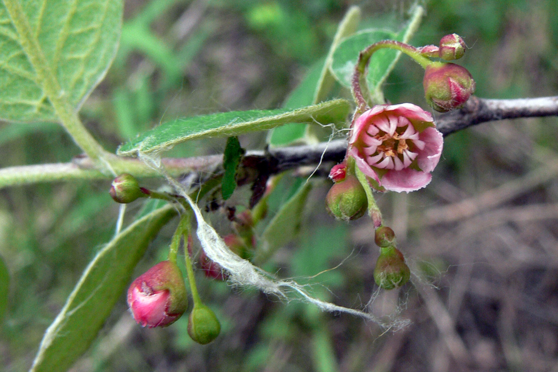 Цветки мелкие, собраны в рыхлые опушенные кистевидные соцветия, состоящие из 3-15 цветков, 2-4 см в диаметре. Цветки до 7 мм в диаметре. Цветочная ось и цветоножка опушенные. Прицветники линейные и опушенные. Цветоножка 3-7 (9) мм в длину. Гипантий голый, реже слегка опушенный, колокольчатый. Чашелистики треугольные, 1,5-2,5 мм в длину, с тупой вершинкой. Цветет в мае-июне. Лепестки прямые, розоватые, красноватые или красно-белые, округлые, 3-4 мм в диаметре. Тычинки в силе 20, они короче лепестков. Завязь опушенная на вершинке. Столбиков 3, реже 2, они свободные и короче лепестков. Цветет в мае-июне, до 25 дней.