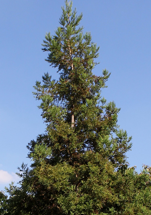 It is an evergreen coniferous tree up to 50-70 m tall with a narrow, dense crown. Grows quickly. Bark is brownish-red, fibrous. Trunk cylindrical, up to 4 m in diameter.