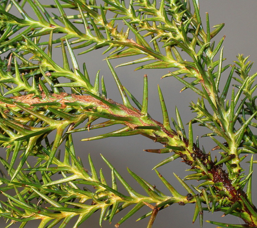 Leaves are arranged spirally and densely, light green, linear-acicular, curved at the base, up to 2.5 cm long, laterally compressed, three-angled, blunt in cross-section, and persist on the tree for up to 7 years. In winter they become yellowish.