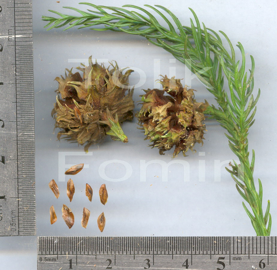 Seed cones are nearly globular, up to 2 cm in diameter, brownish, solitary, and have 20-30 wedge-shaped woody scales. Cones mature in the first year and remain on the branches after seed shedding until the next summer. The bracts are fused to the seed scales from the underside to the middle. Seeds up to 6 mm long, ovate-elongated, three-angled with a light whitish spot at the base; along the edges narrowly longitudinally winged and flattened (2-3 narrow wings).