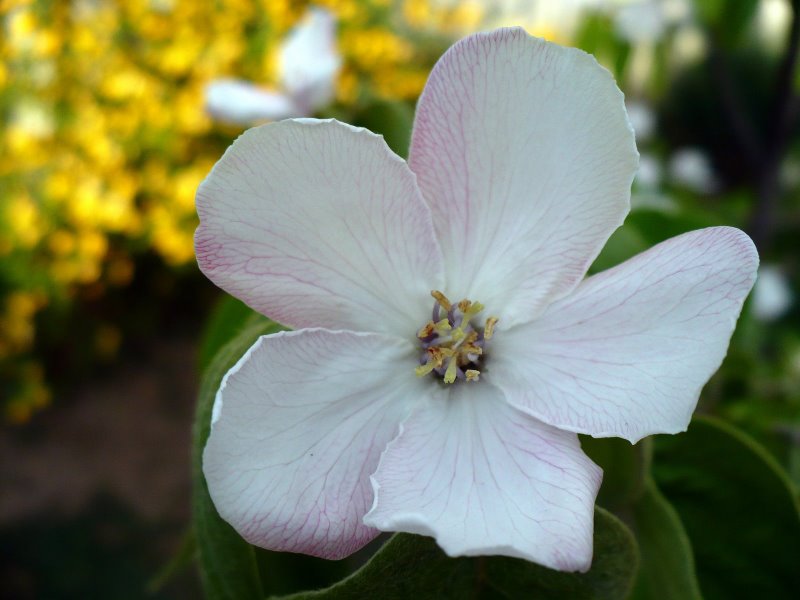 Цветет в мае-июне (около 3 недель), цветки большие, до 5 см в диаметре, правильные, одиночные, на коротких цветоножках, двуполые, белые или розовые, с пятью лепестками, имеют приятный аромат. Тычинок 15-25, 5 столбиков, плодолистников 5, сросшихся с цветоложем, чашелистники цельные, отогнутые, продолговатые, 5 штук.