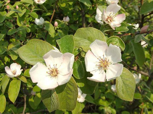 Цветет в средние сроки, цветки белые, красивой правильной формы с короткими цветоножками, обычные для айвы. Сорт самоплодный.