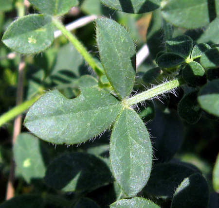 Листья часто простые, реже тройчатые, сидячие, продолговатой или обратнояйцевидной формы, 0,6-1,5 (2) см в длину, заостренные на верхушке и суженные к основанию, густо зеленого цвета, покрыты оттопыренными волосками, особенно сильно снизу и по краям, беловатые от опушения. Прилистники отсутствуют.