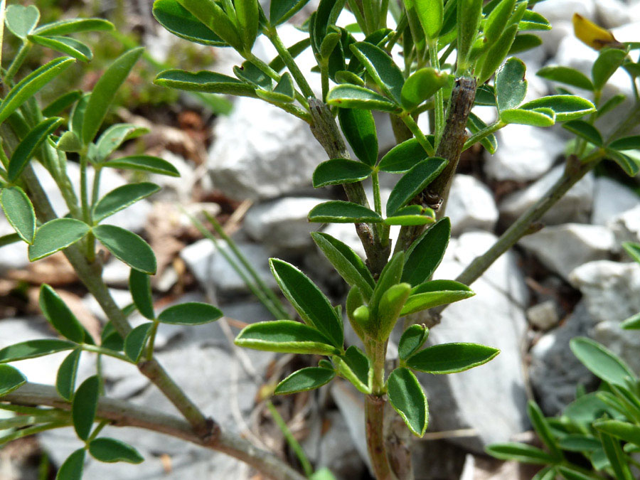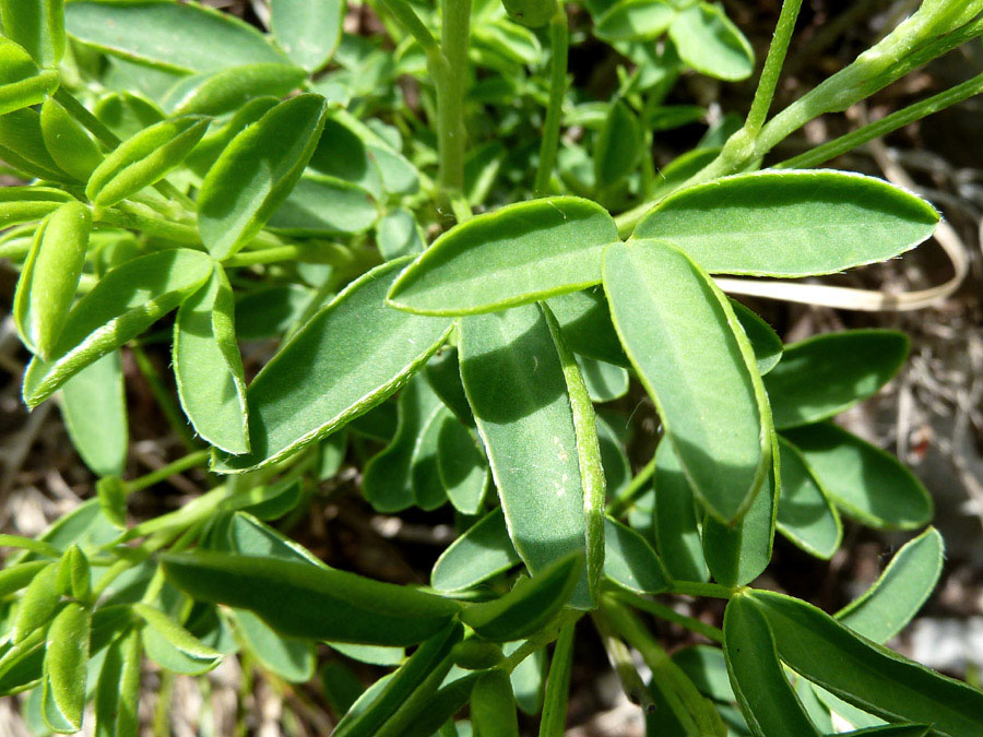 Листья тройчатые, на длинных черешках. Листочки сидячие, обратнояйцевидной или продолговатой формы, 5-25 мм в длину, сверху голые и темно-зеленые, снизу шелковисто опушенные и бледно-зеленые, края цельные, часто завернутые вовнутрь, вершинка острая, основание округлое.