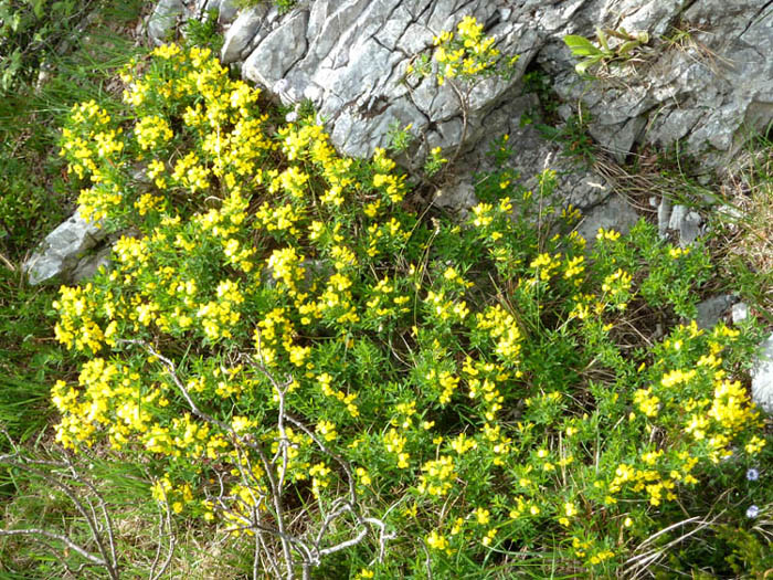 Цветы появляются в пазухах листьев на побегах прошлого года, собраны по 1-4, мотыльковые, желтые. Чашечка 10-15 мм в длину, двугубая, колокольчатая. Верхняя губа чашечки двузубчатая, нижняя – с 3 короткими лопастями. Парус длиннее крыльев и лодочки. Крылья по верхнему краю складчато-морщинистые. Тычинок 10, сросшихся в трубочку. Столбик искривленный, с голвчатым рыльцем. Завязь сидячая. Цветоножки длинные, густо шелковисто опушенные. Цветет в мае-июне.