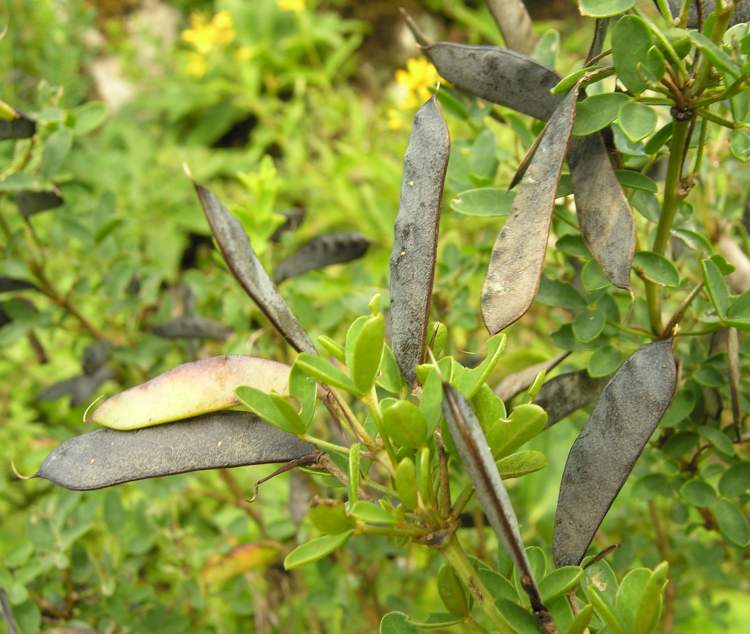 Плоды плоские, широколинейные и голые многосемянные бобы, 2,5-4 см в длину, растрескиваются при созревании. Семена почковидные, блестящие, плоские, с присемянником.