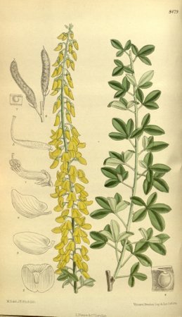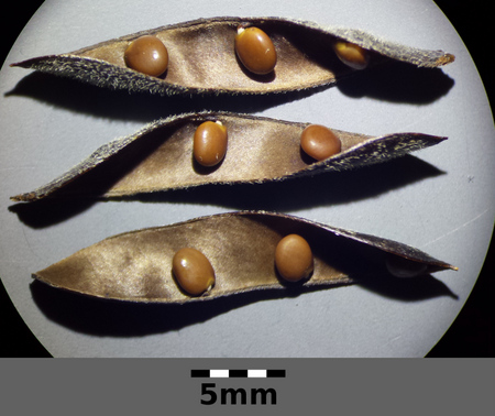 Бобы линейно-ланцетной формы, 2-2,5 см в длину и 5 мм в ширину, густо и коротко прижато волосистые. Семена черного цвета. Цветет и плодоносит с 2 лет.