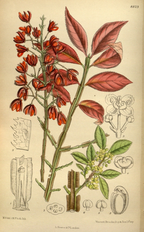 Зато многочисленные плоды уж порадуют Вас и Ваших гостей и осенью, и зимой. На фоне еще зеленых листьев гирлянды ярких плодов смотрятся удивительно контрастно. Издали кажется, что растение цветет. Они очень оригинальные красноватые, а кожистая четырехгранная коробочка при созревании окрашивается в яркие оранжевые тона, остаются висеть на ветвях гораздо дольше листьев, практически всю зиму. Когда приходит время «горения» листвы, коробочки растрескиваются по швам, образуя «парашют», под которым на коротких ножках висят «парашютисты» - несколько семян, покрытых ярко-оранжевой кожицей. Такими оригинальными плодами обладают только бересклеты. Что касается их ядовитости, то они не столь опасны, как это преподносится в некоторых изданиях. Плоды бересклетов действительно содержат ряд ядовитых алкалоидов, но придется съесть их очень много для того, чтобы отравиться взрослому человеку. Они сладковатые, но имеют чрезвычайно неприятный привкус и поэтому съесть их много крайне тяжело. Даже в небольших дозах обладают рвотным и сильным слабительным действием. Но все же, обратите на это внимание, если у Вас есть маленькие дети или внуки.