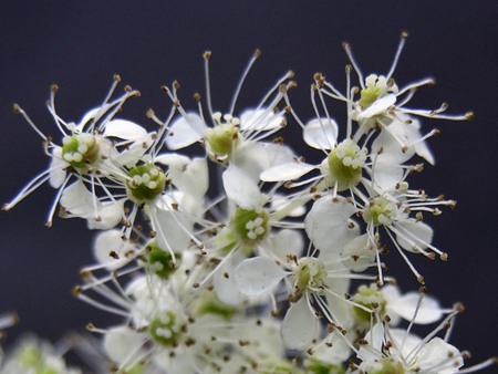 Flowers numerous, white, pink or red, arranged in terminal corymbose-panicle inflorescences. Blooms in early summer. Flowers hermaphroditic, less often unisexual. Sepals 5, they reflex after flowering. Petals 5, arranged imbricately, clawed at the base. Stamens 20-40. Carpels 5-15. Perianth double.