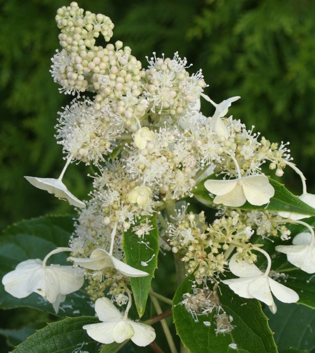 Цветет обильно, с середины июня до октября. Цветы собраны в длинные ажурные широкопирамидальные и густоволосистые метелки до 25 см в длину, с приятным ароматом. Фертильные цветки мелкие, белые, с рано опадающими лепестками. Стерильные цветки более крупные, до 2,5 см в диаметре, с 4 белыми лепестками, которые позже становятся розовыми. Цвести и плодоносить начинает в 4-5 лет.