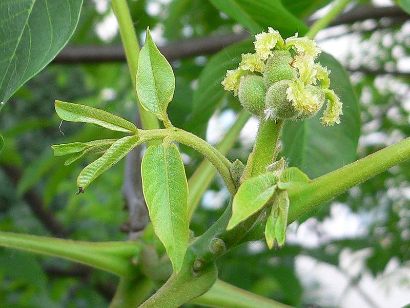Плод - костянка с мясистой зеленой оболочкой, подсыхающей и чернеющей на дереве. Оболочка при созревании растрескивается еще на дереве. Семя заключено в костяную, морщинистую оболочку из двух створок, соединенных выступающим ребром. Зреет в сентябре.Плодоношение начинается с 8-10 летнего возраста и продолжается до 150-200 лет и дольше. Количество урожая с одного дерева 25 кг (максимальное 150 кг).