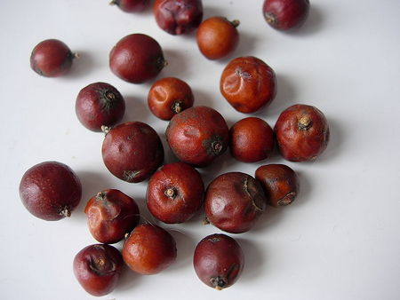 The plant is dioecious. Male cones are yellow, 2-3 mm long; after releasing pollen they fall off in late winter or early spring. Female cones are berry-like, mature over 18 months, green. Fruits are almost sessile, borne singly, 6-7 (11-12) mm in diameter, nearly globose, glossy, reddish-brown, with 2-3 (rarely 1-4) seeds inside. Seeds are broadly ovate, slightly three-sided.
