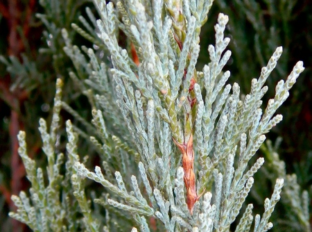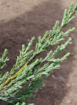 Листья в основном чешуевидные, расположены супротивно, прижатые к побегу, яйцевидно-ромбические, верхушка туповатая, 1-2 мм в длину и 0,5-1 мм в ширину, темно-зеленые, чаще сизовато-синие или сине-серые. Игловидные листья могут находиться на самой верхушке, они достигают 12 мм в длину и до 2 мм в ширину.